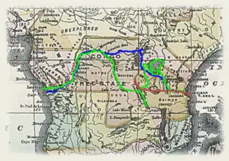 Après cette expédition couronnée de succès et la mort de Livingstone en 1873[3], Stanley poursuit ses explorations de l'Afrique équatoriale, qu'il traverse d'est en ouest en partant de Zanzibar en 1874. L’expédition, financée par le Daily Telegraph[2] et le New York Herald[3], mobilise plus de 230 personnes, porteurs et soldats, et même un bateau de treize mètres en pièces détachées[2], le Lady Alice. Stanley part de Zanzibar le [2]. Il doit recruter d’autres compagnons en cours de route. Il gagne le lac Victoria par l'itinéraire de John Hanning Speke, et effectue la circumnavigation du lac. Il visite le Buganda, passe par le lac Albert découvert en 1864 par Samuel White Baker et Florence Baker[16], et explore la totalité des rives du lac Tanganyika du 11 juin au 31 juillet. (en rouge sur la carte)
