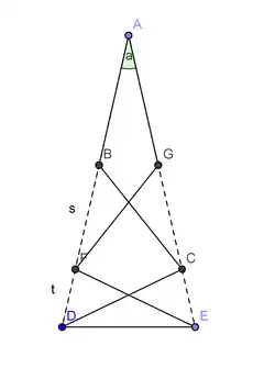 - Les droites (FC) et (DE) étant parallèles, l'angle ACF vaut 3a. Comme l'angle ACB vaut a, l'angle BCF vaut 3a – a = 2a. Le triangle BFC est donc isocèle et FC = FB = s