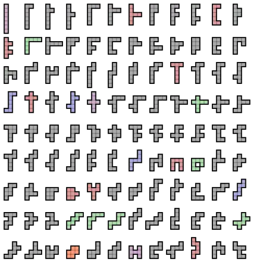 Cependant, l'ensemble des 107 heptaminos libres simplement connexes - c'est-à-dire ceux qui n'ont pas de trou - peut carreler un rectangle de 7 x 107 (749 carrés)[6]. En outre, l'ensemble complet d'heptaminos libres peut carreler trois rectangles de 11 sur 23 (253 carrés), chacun avec un trou d'un carré au centre ; l'ensemble complet peut également carreler douze carrés de 8 sur 8 (64 carrés) avec un trou d'un carré au centre[7].