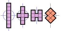 - 1 heptamino (de couleur orange) possède deux axes de symétrie de réflexion, tous deux alignés avec les diagonales. Son groupe de symétrie comporte également quatre éléments. Son groupe de symétrie est aussi le groupe dièdre d'ordre 2 à quatre éléments.