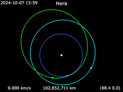 La sonde spatiale Hera est lancée le 7 octobre 2024[Note 1] par une fusée Falcon 9 de la société SpaceX qui décolle depuis Cape Canaveral (États-Unis). Le lanceur spatiale est mis en œuvre dans une version non réutilisable (donc plus puissante), car elle communique à Hera une vitesse excédant de 5,9 km/s la vitesse de libération (11,2 km/s) de la Terre (valeur record à ce jour pour une mission interplanétaire lancée par un lanceur Falcon 9)[28]. La sonde spatiale circule initialement sur une orbite héliocentrique de 2,27 × 1,01 unités astronomiques avec une inclinaison orbitale de 2,3 degrés et une apoapside (aphélie) située entre les planètes Mars et Jupiter[22].