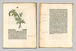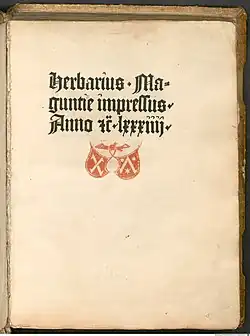- ↑ Herbarius moguntinus. Ausgabe Vicence 1491. Titelblatt (lien image)