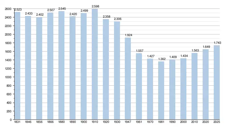 Les chiffres des années 1831 à 1970 tiennent compte des chiffres des anciennes communes fusionnées.