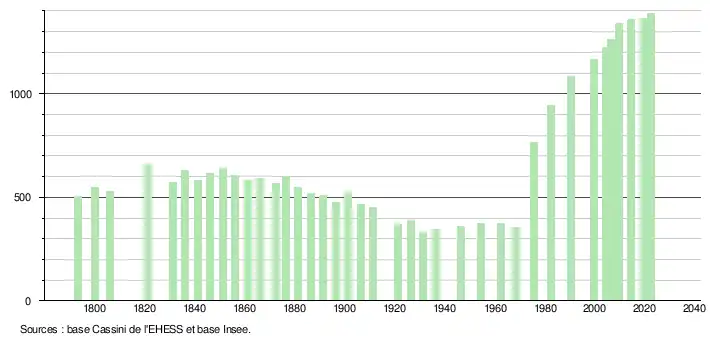 L'évolution du nombre d'habitants est connue à travers les recensements de la population effectués dans la commune depuis 1793. Pour les communes de moins de 10 000 habitants, une enquête de recensement portant sur toute la population est réalisée tous les cinq ans, les populations de référence des années intermédiaires étant quant à elles estimées par interpolation ou extrapolation[19]. Pour la commune, le premier recensement exhaustif entrant dans le cadre du nouveau dispositif a été réalisé en 2004[20].