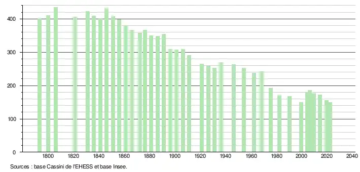 L'évolution du nombre d'habitants est connue à travers les recensements de la population effectués dans la commune depuis 1793. Pour les communes de moins de 10 000 habitants, une enquête de recensement portant sur toute la population est réalisée tous les cinq ans, les populations de référence des années intermédiaires étant quant à elles estimées par interpolation ou extrapolation[22]. Pour la commune, le premier recensement exhaustif entrant dans le cadre du nouveau dispositif a été réalisé en 2004[23].