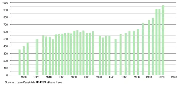 L'évolution du nombre d'habitants est connue à travers les recensements de la population effectués dans la commune depuis 1793. Pour les communes de moins de 10 000 habitants, une enquête de recensement portant sur toute la population est réalisée tous les cinq ans, les populations de référence des années intermédiaires étant quant à elles estimées par interpolation ou extrapolation[22]. Pour la commune, le premier recensement exhaustif entrant dans le cadre du nouveau dispositif a été réalisé en 2006[23].