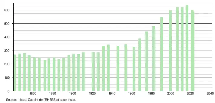 L'évolution du nombre d'habitants est connue à travers les recensements de la population effectués dans la commune depuis 1841. Pour les communes de moins de 10 000 habitants, une enquête de recensement portant sur toute la population est réalisée tous les cinq ans, les populations de référence des années intermédiaires étant quant à elles estimées par interpolation ou extrapolation[19]. Pour la commune, le premier recensement exhaustif entrant dans le cadre du nouveau dispositif a été réalisé en 2006[20].