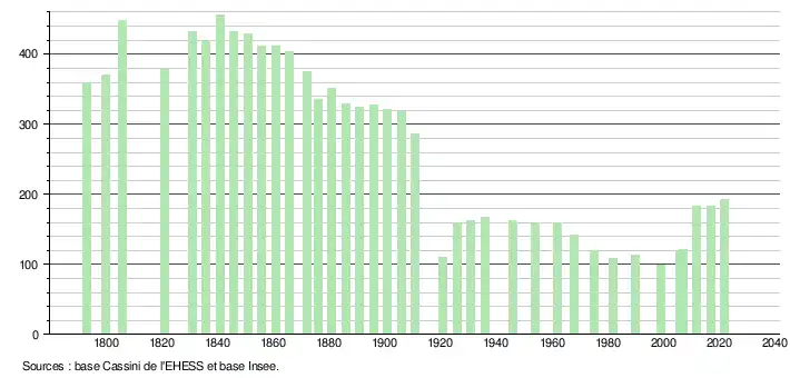 L'évolution du nombre d'habitants est connue à travers les recensements de la population effectués dans la commune depuis 1793. Pour les communes de moins de 10 000 habitants, une enquête de recensement portant sur toute la population est réalisée tous les cinq ans, les populations de référence des années intermédiaires étant quant à elles estimées par interpolation ou extrapolation[32]. Pour la commune, le premier recensement exhaustif entrant dans le cadre du nouveau dispositif a été réalisé en 2007[33].