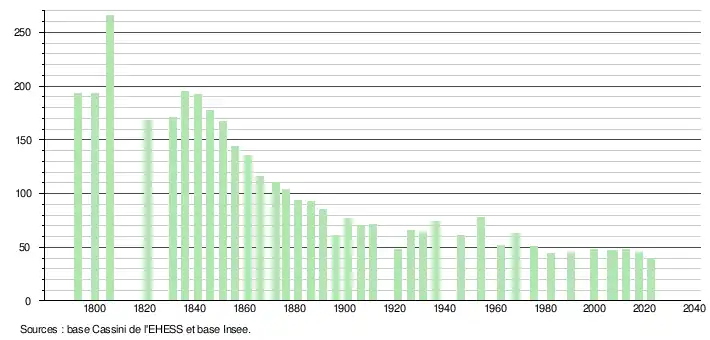 L'évolution du nombre d'habitants est connue à travers les recensements de la population effectués dans la commune depuis 1793. Pour les communes de moins de 10 000 habitants, une enquête de recensement portant sur toute la population est réalisée tous les cinq ans, les populations de référence des années intermédiaires étant quant à elles estimées par interpolation ou extrapolation[28]. Pour la commune, le premier recensement exhaustif entrant dans le cadre du nouveau dispositif a été réalisé en 2007[29].