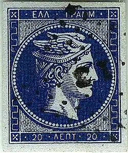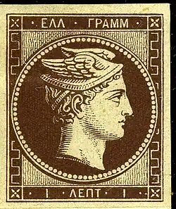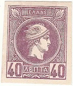 Le premier type de timbres de Grèce est dénommé « grosse tête d'Hermès » pour le différencier du type suivant, émis en 1886 et dit de la « petite tête d'Hermès »[15].