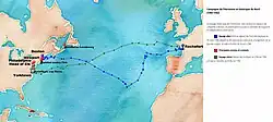 - ↑ Gérard Piouffre, Transcription du « Journal de la frégate du Roi l’Hermione de 32 canons, commandée par M. de Latouche, lieutenant de vaisseau », Heyrieux, J2P Éditions.