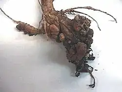 Cela provoque la formation de galles qui peuvent se développer suffisamment pour restreindre le xylème et ainsi inhiber l'absorption de l'eau par la plante. Les galles sur les racines, appelées « hernies », prennent la forme de massues ou de fuseaux . Finalement, elles entraînent la pourriture des racines et la mort de la plante[1].