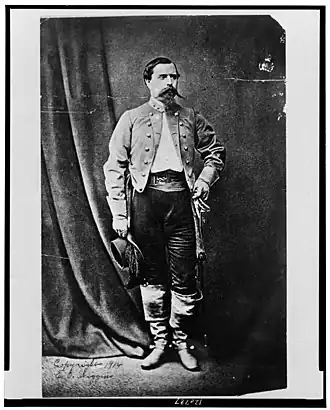- ↑ Sur ce point, un officier autrichien de hussards, visitant le Sud en 1863, remarquait à propos de la cavalerie confédérée : C'est, en réalité, une infanterie montée… Il n'y a pas le temps de les former comme cavaliers, et de leur apprendre le bon usage du sabre – l'arme de base d'une vraie cavalerie -… (cf.Ph Katcher, Confederate Cavalryman 1861-65, page 13, Osprey Publishing, W54, 2002, (ISBN 1-84176-381-0) - Starr (p. 347) rapporte les exclamations des sudistes appelant leurs adversaires à combattre comme des gentlemen, en laissant tomber leurs sabres pour s'expliquer à coups de revolvers…"