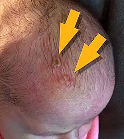 Les parents et l’entourage doivent recevoir des recommandations et explications sur les signes cliniques à surveiller, et sur les précautions à prendre. Il a été constaté que les lésions pouvaient apparaitre préférentiellement sur des zones de la peau ou du cuir chevelu du nouveau-né qui ont été traumatisées (par exemple par des forceps ou par la pose d'électrodes de monitoring sur le crâne du fœtus[50]), ces zones si elles existent doivent être surveillées.