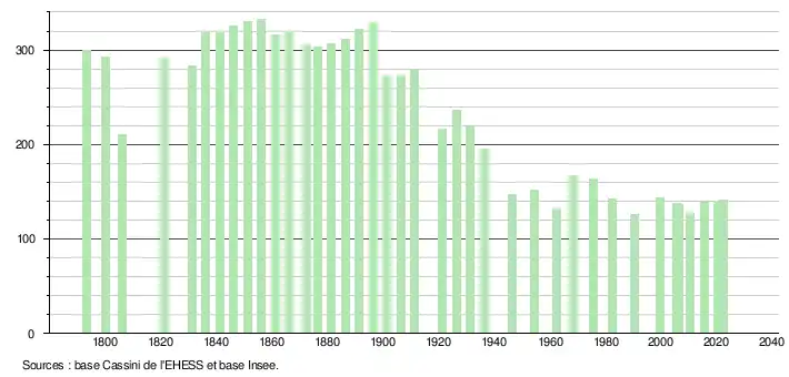 L'évolution du nombre d'habitants est connue à travers les recensements de la population effectués dans la commune depuis 1793. Pour les communes de moins de 10 000 habitants, une enquête de recensement portant sur toute la population est réalisée tous les cinq ans, les populations de référence des années intermédiaires étant quant à elles estimées par interpolation ou extrapolation[22]. Pour la commune, le premier recensement exhaustif entrant dans le cadre du nouveau dispositif a été réalisé en 2005[23].