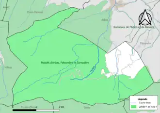 L’inventaire des zones naturelles d'intérêt écologique, faunistique et floristique (ZNIEFF) a pour objectif de réaliser une couverture des zones les plus intéressantes sur le plan écologique, essentiellement dans la perspective d’améliorer la connaissance du patrimoine naturel national et de fournir aux différents décideurs un outil d’aide à la prise en compte de l’environnement dans l’aménagement du territoire. Deux ZNIEFF de type 1[Note 2] sont recensées sur la commune[17] : les « massifs d'Arbas, Paloumère et Cornudère » (3 918 ha), couvrant 11 communes dont deux dans l'Ariège et neuf dans la Haute-Garonne[18] et les « ruisseaux de l'Arbas et de Rieuaris » (64 ha), couvrant 9 communes du département[19] et une ZNIEFF de type 2[Note 3],[17] : le « massif de l'Arbas » (27 233 ha), couvrant 45 communes dont 24 dans l'Ariège et 21 dans la Haute-Garonne[20].