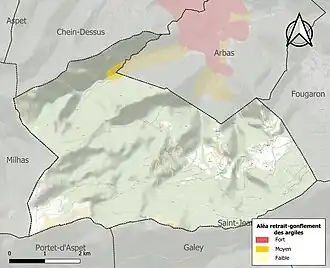 La commune est vulnérable au risque de mouvements de terrains constitué principalement du retrait-gonflement des sols argileux[26]. Cet aléa est susceptible d'engendrer des dommages importants aux bâtiments en cas d’alternance de périodes de sécheresse et de pluie. 0,6 % de la superficie communale est en aléa moyen ou fort (88,8 % au niveau départemental et 48,5 % au niveau national). Sur les 80 bâtiments dénombrés sur la commune en 2019, 0 sont en aléa moyen ou fort, soit 0 %, à comparer aux 98 % au niveau départemental et 54 % au niveau national. Une cartographie de l'exposition du territoire national au retrait gonflement des sols argileux est disponible sur le site du BRGM[27],[Carte 3].