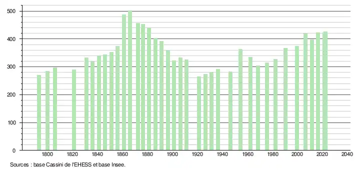 L'évolution du nombre d'habitants est connue à travers les recensements de la population effectués dans la commune depuis 1793. Pour les communes de moins de 10 000 habitants, une enquête de recensement portant sur toute la population est réalisée tous les cinq ans, les populations de référence des années intermédiaires étant quant à elles estimées par interpolation ou extrapolation[23]. Pour la commune, le premier recensement exhaustif entrant dans le cadre du nouveau dispositif a été réalisé en 2006[24].