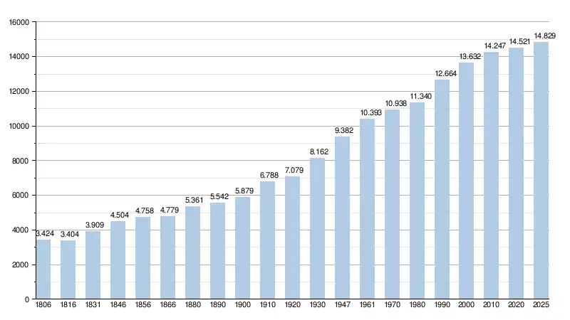 - Source : Statbel - Remarque: 1806 jusqu'à 1981=recensement; depuis 1990=nombre d'habitants chaque 1er janvier[5]