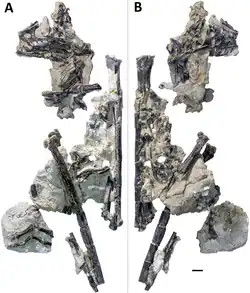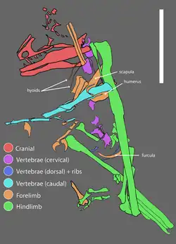 Il est composé de la partie arrière du crâne, de la mandibule, des os hyoïdes, de cinq vertèbres cervicales, de la première vertèbre dorsale, de douze vertèbres de la queue, d'une côte, d'arcs hémaux, de la partie gauche de la ceinture scapulaire, de l’humérus droit, du bras gauche, des pattes arrière - sauf les orteils droits -. Le squelette est en partie en connexion anatomique. Il est celui d'un spécimen adulte ou subadulte[1].