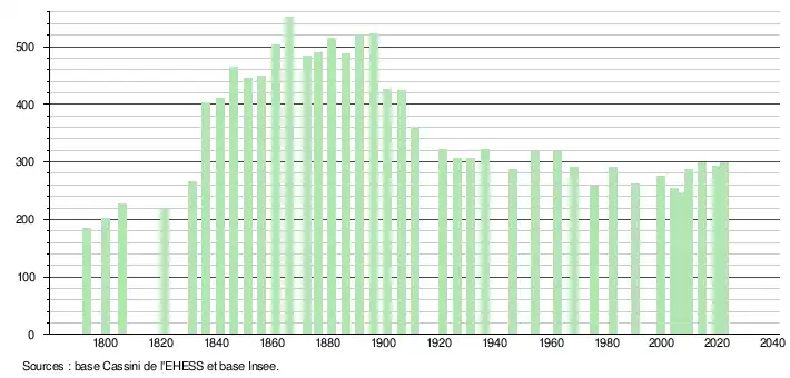 L'évolution du nombre d'habitants est connue à travers les recensements de la population effectués dans la commune depuis 1793. Pour les communes de moins de 10 000 habitants, une enquête de recensement portant sur toute la population est réalisée tous les cinq ans, les populations de référence des années intermédiaires étant quant à elles estimées par interpolation ou extrapolation[23]. Pour la commune, le premier recensement exhaustif entrant dans le cadre du nouveau dispositif a été réalisé en 2004[24].