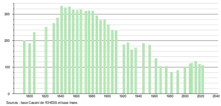 L'évolution du nombre d'habitants est connue à travers les recensements de la population effectués dans la commune depuis 1793. Pour les communes de moins de 10 000 habitants, une enquête de recensement portant sur toute la population est réalisée tous les cinq ans, les populations de référence des années intermédiaires étant quant à elles estimées par interpolation ou extrapolation[32]. Pour la commune, le premier recensement exhaustif entrant dans le cadre du nouveau dispositif a été réalisé en 2008[33].