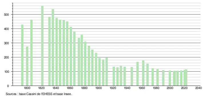 L'évolution du nombre d'habitants est connue à travers les recensements de la population effectués dans la commune depuis 1793. Pour les communes de moins de 10 000 habitants, une enquête de recensement portant sur toute la population est réalisée tous les cinq ans, les populations de référence des années intermédiaires étant quant à elles estimées par interpolation ou extrapolation[20]. Pour la commune, le premier recensement exhaustif entrant dans le cadre du nouveau dispositif a été réalisé en 2005[21].