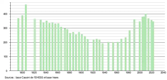 L'évolution du nombre d'habitants est connue à travers les recensements de la population effectués dans la commune depuis 1793. Pour les communes de moins de 10 000 habitants, une enquête de recensement portant sur toute la population est réalisée tous les cinq ans, les populations de référence des années intermédiaires étant quant à elles estimées par interpolation ou extrapolation[18]. Pour la commune, le premier recensement exhaustif entrant dans le cadre du nouveau dispositif a été réalisé en 2004[19].