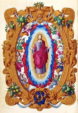 - les folios 3v, 5v, 36v, 62v sont attribués au Maître des épîtres Getty, du nom d'un manuscrit conservé au Getty Center, qui pourrait être identifié au peintre anversois Noël Bellemare, actif à Paris entre 1515 et 1546. Les encadrements de ces quatre miniatures pourraient être de la main de Luca Penni.