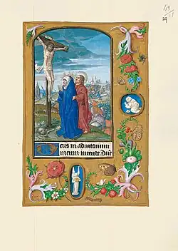 Les parties les plus innovatrices de ce manuscrit très abondamment enluminé, se trouvent dans deux cycles iconographiques différents, les Heures de la Croix et celles de la Vierge. Les Heures de la Croix présentent quatorze miniatures, regroupées deux par deux, qui renvoient au récit de la Passion du Christ, depuis l'entrée à Jérusalem jusqu'à la sainte mise au tombeau. Celles de la Vierge contiennent huit ensembles de deux miniatures regroupées sur deux pages. Le plus souvent, on place un épisode de la vie de la Vierge – à partir de l'Annonciation, pour arriver au Couronnement –, près d’un épisode de l'Ancien Testament en rapport avec lui. Ces deux cycles sont ceux qui contiennent les meilleures miniatures du codex. L’artiste y réduit au minimum la place du texte, parfois avec seulement deux bases d’écriture, afin d’offrir le plus grand espace possible à l'enluminure. L'uniformité du style retenu pour les marges contribue à donner de la continuité et une unité visuelle à ces insertions.