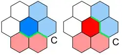 Le sommet C ne peut être atteint par la ligne verte. Pour s'en rendre compte, il suffit d'imaginer que l'hexagone du tablier connexe au sommet C est bleu foncé, illustré sur la figure de gauche. Cet hexagone est nécessairement à gauche de la ligne verte (parcourue dans le sens A vers C), ce qui est impossible car les hexagones situés à gauche de la ligne sont tous rouges. Si le même hexagone est rouge foncé, il est à droite de la ligne verte, ce qui est encore impossible[17].