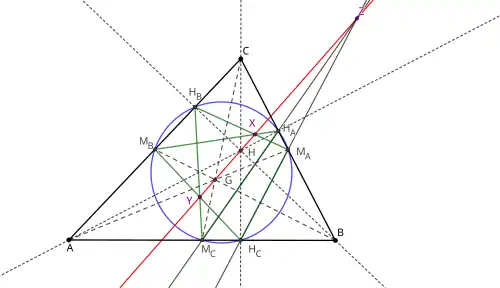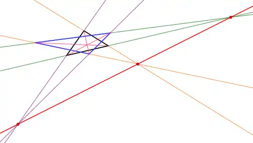 En utilisant une étoile de David irrégulière (deux triangles entrelacés), on peut retrouver les trois intersections alignées. Dans ce cas, ce n'est plus un hexagone, et l'alignement est expliqué par le théorème de Desargues.