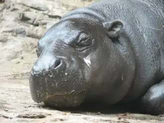 L'hippopotame pygmée (Choeropsis liberiensis[1] ou Hexaprotodon liberiensis) appelé aussi Hippopotame nain ou encore Hippopotame nain africain, est une espèce d'hippopotames originaire des forêts et des marécages de l'Afrique de l'Ouest. Ce mammifère est un animal discret, solitaire et nocturne même si la masse d'un mâle adulte peut avoisiner 275 kg. Il est une des deux seules espèces encore existantes dans la famille des Hippopotamidae, l'autre étant son cousin beaucoup plus imposant, l'hippopotame commun, dit amphibie.