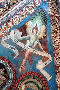 Les Archanges sont les messagers extraordinaires de Dieu auprès des hommes. Saint Thomas d'Aquin place trois archanges ici : saint Michel, saint Gabriel et saint Raphaël. Cette tradition est reprise par le Magistère de l'Église Catholique Romaine. Le mot Archange (ἀρχάγγελος, arkhággelos) signifie en grec « dirigeant des anges », αρχι- (archí-) étant un préfixe désignant celui qui dirige. Ceux qui annoncent des nouvelles ordinaires sont des anges, mais ceux qui annoncent de grands événements sont des archanges. Ce sont eux qui dirigent les anges et leurs assignent leurs tâches quotidiennes[14]. Les Archanges ont le costume militaire, tunique et manteau, glaive, lance et bouclier ; les Grecs y ajoutent le sceau de Dieu. À Milan, le phylactère dénote qu'ils sont des messagers célestes et parlent au nom de Dieu[16].