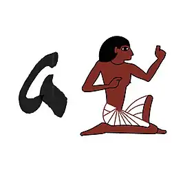 Il représente un homme accroupi, en génuflexion, bras droit en équerre et bras gauche replié et en retrait, il est translittéré j.