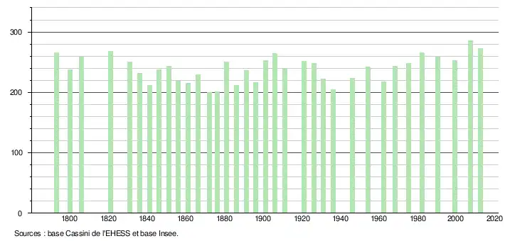 - ↑ Par convention dans Wikipédia, le principe a été retenu de n’afficher dans le tableau des recensements et le graphique, pour les populations légales postérieures à 1999, que les populations correspondant à une enquête exhaustive de recensement pour les communes de moins de 10 000 habitants, et que les populations des années 2006, 2011, 2016, etc. pour les communes de plus de 10 000 habitants, ainsi que la dernière population légale publiée par l’Insee pour l'ensemble des communes.