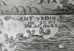 Une autre expression consacrée, utilisée par les cartographes romains et médiévaux pour annoter les zones inconnues de leurs cartes, était hic sunt leones (« ici sont des lions »).