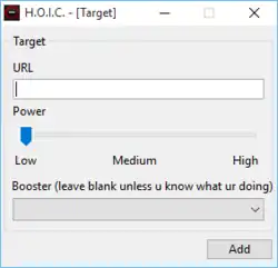 HOIC exploite une interface graphique facile à utiliser. Pour lancer une attaque, il faut spécifier l’URL cible, choisir la puissance (faible, moyenne, élevé), ajouter des scripts .hoic qui définissent différents paramètres et, enfin, appuyer sur « FIRE TEH LAZER » (Tire l' laser).