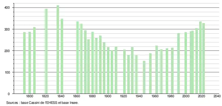 L'évolution du nombre d'habitants est connue à travers les recensements de la population effectués dans la commune depuis 1793. Pour les communes de moins de 10 000 habitants, une enquête de recensement portant sur toute la population est réalisée tous les cinq ans, les populations de référence des années intermédiaires étant quant à elles estimées par interpolation ou extrapolation[19]. Pour la commune, le premier recensement exhaustif entrant dans le cadre du nouveau dispositif a été réalisé en 2008[20].