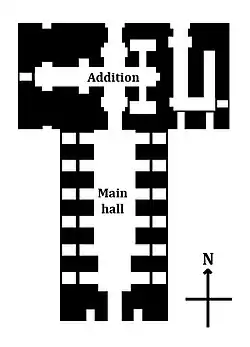 Le plan du Hindola Mahal est en forme de T, si l'examen des murs extérieurs conduit à la conclusion que la barre transversale a été ajoutée tardivement. Le mât vertical du plan correspond à une salle unique qui mesure 30 mètres de long, 18 mètres de large et 12 mètres de haut. Ses parois latérales mesurent 3 mètres d'épaisseur et sont renforcés par des contreforts inclinés d'un ange de 77 degrés, ce qui donne au palais son aspect incliné et d'où son nom Hindola Mahal (le palais dansant). Les contreforts ont aussi servi à neutraliser la force extérieure de cinq arcs en accolade qui servaient à supporter le poids du toit du hall principal[1]. Un haut mur maintient des fortifications sur le toit de l'immeuble[4].