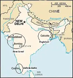Environ 5 000 Juifs résident aujourd'hui en Inde[34]. Les Bnei Menashe sont un groupe de plus de 9 000 Juifs des États indiens du Manipur et du Mizoram qui résident en Inde depuis le VIIIe siècle av. J.-C.[35]. Le 31 mars 2005, le rabbin séfarade Shlomo Amar, l'un des deux grands rabbins d'Israël, a accepté l'affirmation des Bnei Menashe d'être l'une des dix tribus perdues compte tenu de leur dévotion au judaïsme. Sa décision était importante car elle a ouvert la voie à tous les membres de Bnei Menashe pour entrer en Israël sous la loi du retour d'Israël[36]. Au cours des deux dernières décennies, quelque 1 700 membres de Bnei Menashe ont déménagé en Israël. Israël a inversé la politique d'immigration pour les 7 200 Bnei Menashe restants.