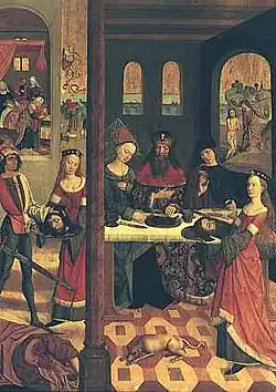 À nouveau, le panneau est partagé en deux parts inégales par un pilier central qui semble être en bois. La scène centrale montre Salomé portant sur un plateau la tête de saint Jean devant la tableau de banquet où ont pris place Hérode, vêtu en roi païen, mais à la robe richement décorée, sa femme et un troisième personnage. Salomé est vêtue d'une robe rouge bordée de fourrure blanche sous laquelle apparaît une jupe verte. L'épouse d'Hérode porte un hennin tronqué surmonté d'un voile transparent. Par la fenêtre, on découvre le paysage du Jourdain où le Christ se fait baptiser par saint Jean. La partie gauche du panneau est plus étroite. Un serviteur qui vient de décapiter saint Jean dont le corps sans tête gît par terre est en train de présenter le plateau avec la tête à Salomé qui, dans un geste d'hésitation, s'en empare. Dans une alcôve au-dessus, on assiste à la naissance de saint Jean. Sa mère, Élisabeth, est à demi couchée dans le lit, la sage-femme au pied du lit est en train de laver ou d'emmailloter le nouveau-né.