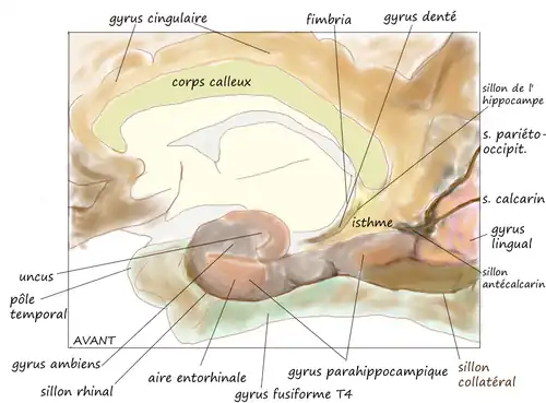 Anatomiquement, l’hippocampe est une élaboration des bords du cortex cérébral[4]. Les structures qui composent les bords intérieurs du cortex font partie du système limbique (du latin « limbus » = bords) : cela inclut l’hippocampe, le cortex cingulaire, le cortex olfactif et l’amygdale (cerveau). Il a longtemps été suggéré que ce système limbique constituait la base neuronale des émotions (voir la théorie du cerveau triunique). Néanmoins, le concept de système limbique est de plus en plus remis en question[5]. Cependant, l’hippocampe est bien connecté à des structures impliquées dans les comportements émotionnels : le septum, le corps mamillaire de l’hypothalamus et le complexe nucléaire antérieure du thalamus. Son rôle limbique ne peut donc pas être totalement écarté.