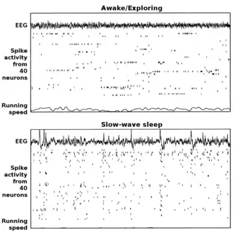 - ↑ Skaggs WE, McNaughton BL, Permenter M, et al. (2007). « EEG sharp waves and sparse ensemble unit activity in the macaque hippocampus ». J Neurophysiol 98 (2): 898–910. DOI 10.1152/jn.00401.2007 .