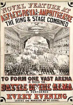 La première pièce écrite spécifiquement pour inclure des chevaux, Timour the Tartar, est également créée à Covent Garden en 1811, puis à New York l'année suivante[10]. Les hippodrames, destinés à une diffusion populaire, reprennent des thèmes connus comme Tamerlan, un conquérant d'Asie centrale, ou le chef militaire ukrainien Ivan Mazepa, ou encore le passé militaire européen avec Marlborough[4]. Mazeppa, or the Wild Horse of Tartary,mis en scène en Angleterre en 1823, est repris dans l'amphithéâtre d'Astley en 1831 puis en tournée aux États-Unis à partir de 1833[11]. D'autres spectacles concernent des adaptations de William Shakespeare (Richard III)[3], des bandits de grand chemin réels et fictifs (Ride to York de Dick Turpin[12], et Paul Clifford[13].