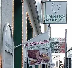 Les bouchers bovins et porcins, dont la corporation est puissante, s'opposent à sa légalisation[88] mais ne peuvent l'empêcher en . Les premières boucheries chevalines ouvrent le à Nancy, et le à Paris, place d'Italie, fournissant de la viande de qualité à des prix inférieurs[89]. Un grand « banquet hippophagique » est organisé à l’occasion de cette ouverture parisienne ; le menu comporte notamment au premier service des potages au consommé de cheval, du saucisson de cheval et de l’aloyau de cheval aux croquettes de pommes de terre, au second service du filet de cheval rôti et une salade de romaine à l'huile de cheval[90]. Les boucheries chevalines à cette époque avaient généralement une enseigne typique constituée de têtes de chevaux en laiton, souvent par trois, et dont un néon rouge soulignait le profil pour que l'enseigne fût reconnue même les soirs d'hiver[91].