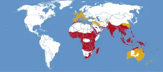 Tout l'Ancien Monde sauf dans le nord et une grande partie de l'Asie (centre et nord) ; Océanie sauf la Nouvelle-Zélande.