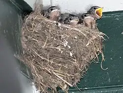 L'Hirondelle rustique est un oiseau attrayant dont la présence dans les bâtiments est tolérée par l'humain car elle se nourrit d'insectes et n'est donc pas considérée comme nuisible aux cultures. Elle est également perçue comme un des premiers signes de l'arrivée du printemps car c'est une des premières espèces migratrices à revenir d'hivernage. En Europe, l'Hirondelle rustique utilise les constructions humaines pour bâtir son nid depuis très longtemps[59], comme en témoigne Virgile dans ses Géorgiques en 29 av. J.-C. : « ... ante/garrula quam tignis nidum suspendat hirundo » («... avant que la gazouillante hirondelle suspende son nid aux chevrons »)[60]. On pense qu'elle a commencé à attacher son nid aux habitations des Indiens d'Amérique au début du XIXe siècle, et la multiplication des implantations humaines a conduit à l'augmentation très rapide du nombre d'hirondelles à travers l'Amérique du Nord[58].