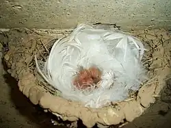 La femelle pond entre deux et sept, mais généralement quatre ou cinq, œufs blancs à petits points roux et gris. Les œufs mesurent entre 20 et 14 mm, pour un poids de 1,9 g, dont 5 % de coquille. En Europe, la femelle effectue presque toute la couvaison, mais en Amérique du Nord le mâle peut couver pendant 25 % du temps. L'incubation dure entre 14 et 19 jours, au cours desquels la femelle maintient constante la température des œufs, en évitant qu'ils se refroidissent mais également parfois qu'ils se réchauffent, lorsque le nid est placé sous des tôles très exposées par exemple. Des femelles ont ainsi été observées s'humidifiant le ventre pour rafraîchir leurs œufs[27]. Après l'éclosion, il faut encore 18 à 23 jours pour que les oisillons quittent le nid. Pendant ce temps, ils sont nourris par leurs parents qui leur apportent régulièrement des insectes, qu'ils agglutinent dans leur bec quand ils chassent. Ils peuvent apporter ainsi une vingtaine d'insectes à la fois, et répètent leurs allées et venues jusqu'à 400 fois par jour. Les jeunes hirondelles atteignent leur poids maximum vers le treizième jour, et pèsent alors environ 22 g. Ce poids se réduira un peu par la suite lorsqu'elles formeront leurs plumes[5]. À partir du quinzième jour, les oisillons n'ont plus besoin de leurs parents pour maintenir leur température constante, et ceux-ci ne les abritent plus que pendant la nuit. Après 18 à 23 jours passés au nid les oisillons vont pouvoir le quitter. Pour les y inciter, leurs parents cessent de les nourrir, puis leur tendent des insectes et lorsque les jeunes se sont suffisamment approchés du bord, lancent des cris d'alerte qui les font chavirer dans le vide. Là, battant leurs ailes par réflexe, les jeunes prennent alors leur premier envol[5]. Les jeunes hirondelles qui commencent à quitter le nid vivent avec leurs parents, qui continuent à les nourrir pendant environ une semaine. Occasionnellement, les jeunes de la première couvée aident à nourrir ceux de la seconde[6]. Au bout de 35 jours, les jeunes sont totalement indépendants.