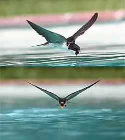 L'Hirondelle rustique s'abreuve au vol, recueillant l'eau dans sa bouche ouverte en volant à ras de l'eau[12]. L'oiseau se baigne de la même façon, plongeant un instant dans l'eau et reprenant son vol aussitôt[13].